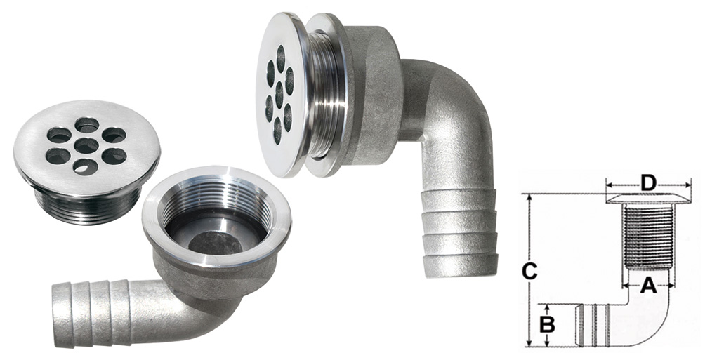 Сливная пробка 90° для душа или кокпита с разъемом для шланга из НЕРЖАВЕЮЩЕЙ СТАЛИ AISI 316 с привинчиваемой верхней частью для монтажа на трубы различной толщины.