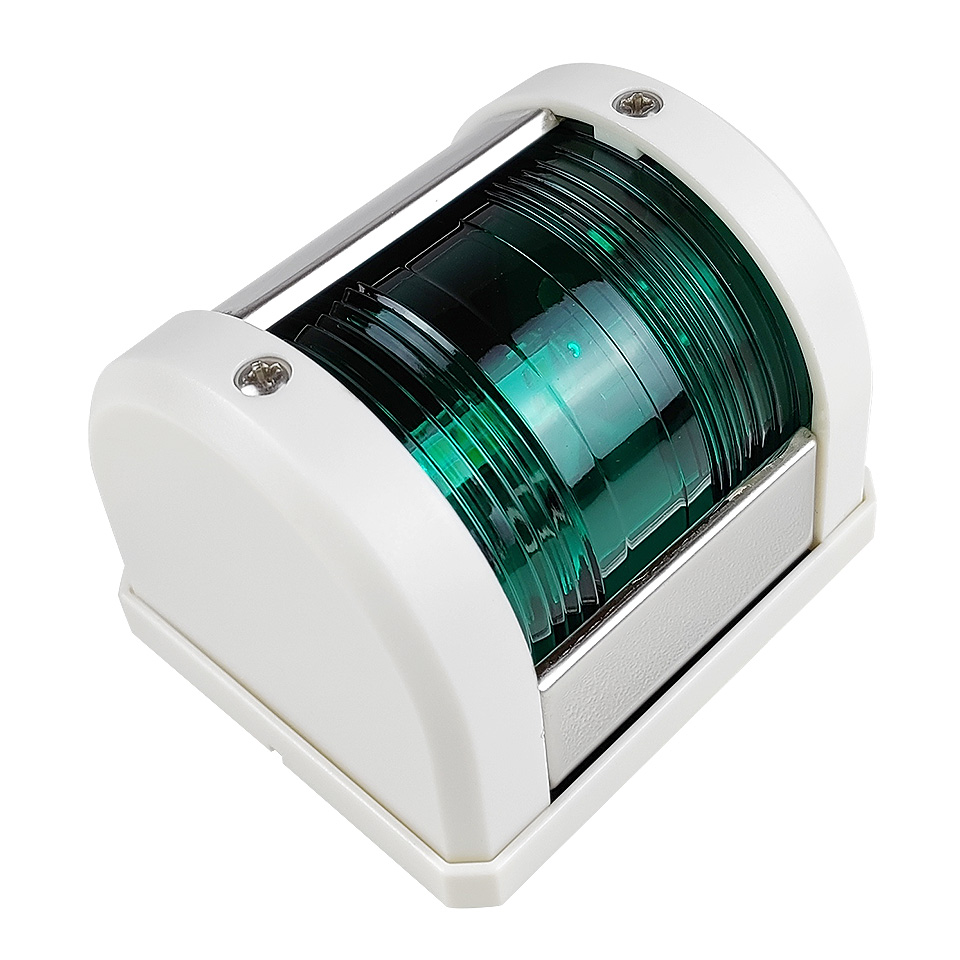 Класический навигационный зелёный огонь устанавливаются на правом борту судна. Обеспечивает освещение секторов с углом в основании 112,5 градусов. В корпусе из пластика белого цвета. Светодиодный.