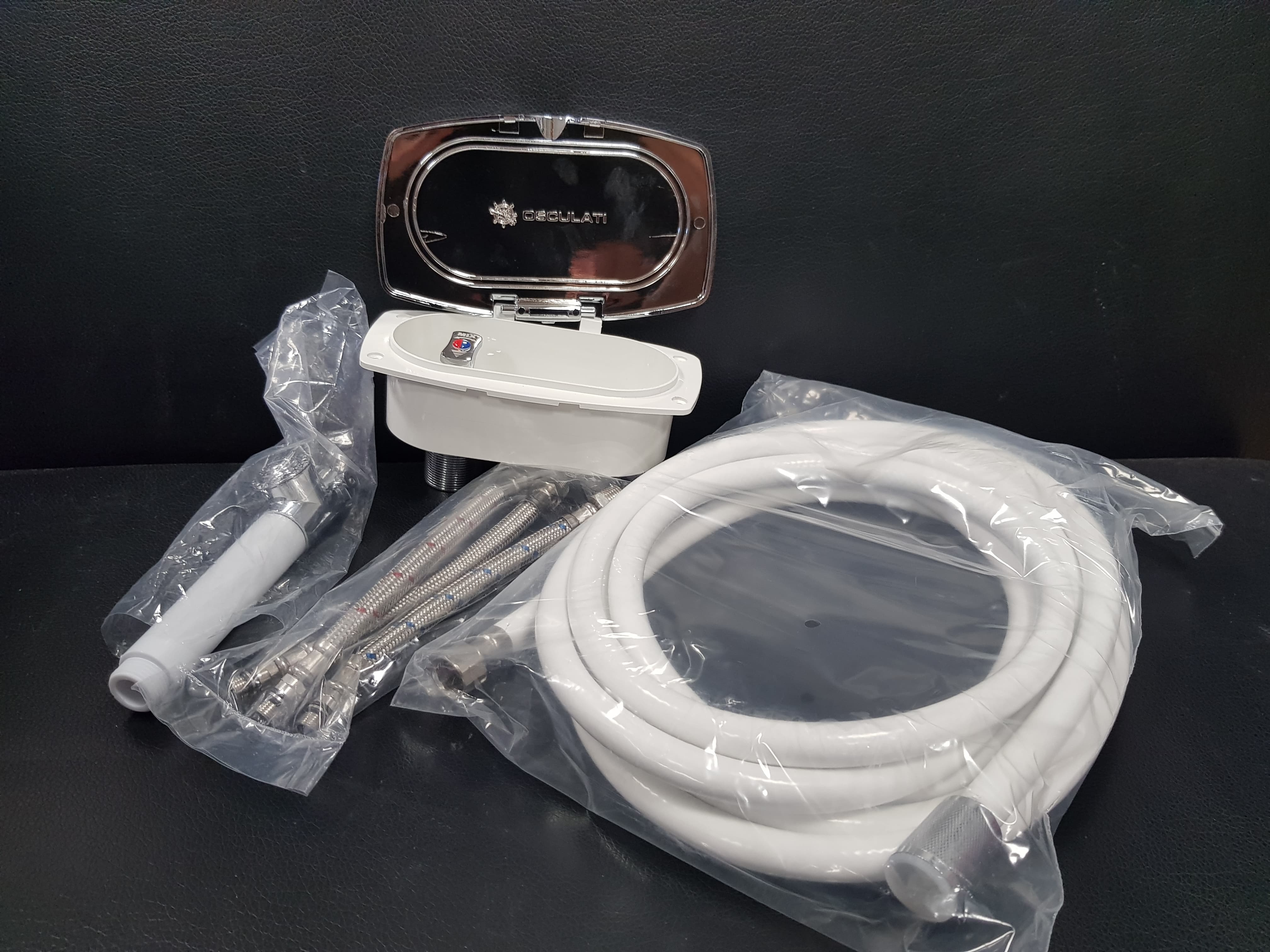 Osculati 15.257.31 - Палубный душ New Edge с лейкой Mizar и смесителем воды, шлангом 4м в корпусе с крышкой из хромированного пластика