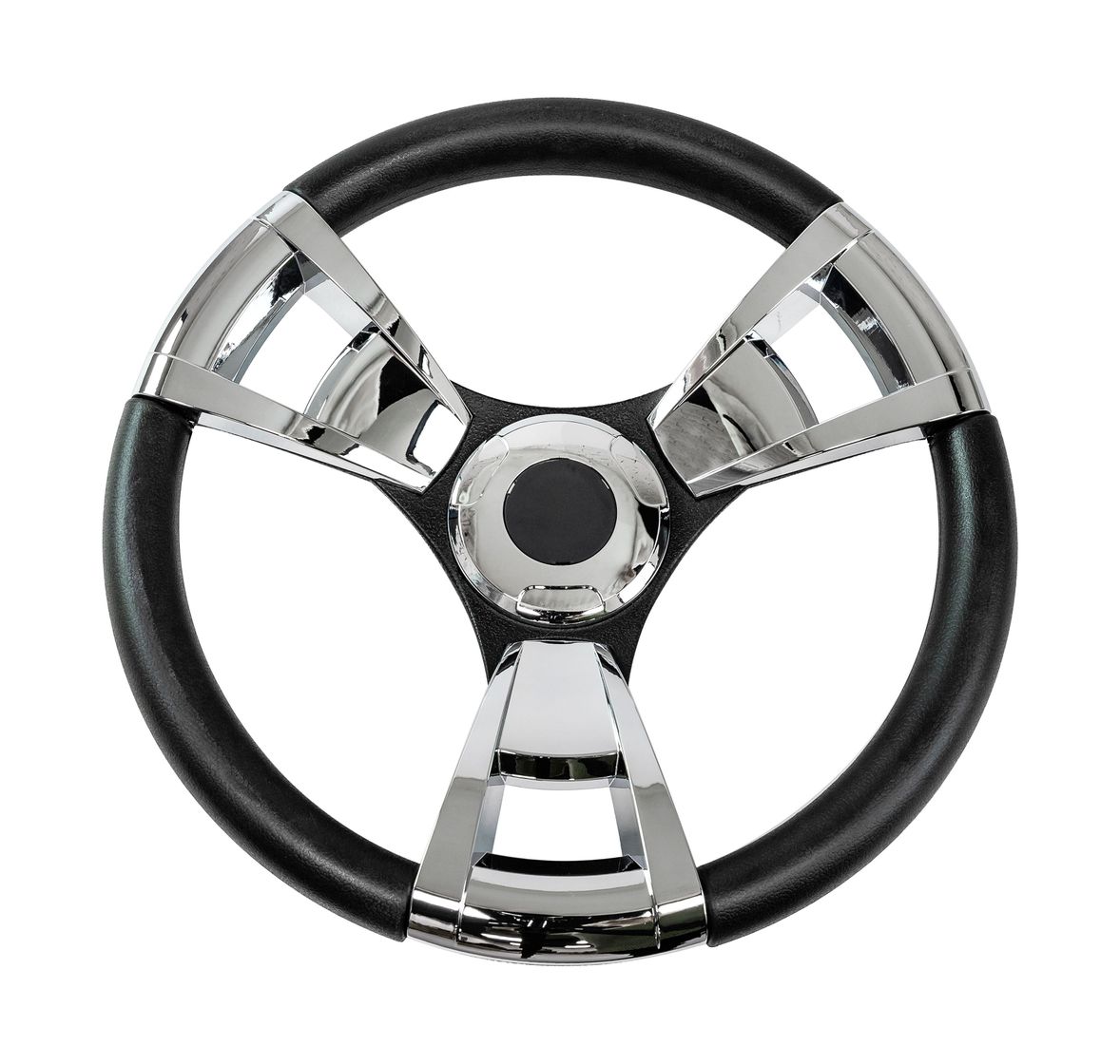 Рулевое колесо от итальянского производителя Gussi, выполнено из полиуретана в современном стиле и представляет собой отличное соотношение цены и качества. Колесо доступно со вставками из хрома, матового хрома или серого цвета, а также в базовой версии полностью в черном цвете.